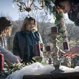 Peux-tu nous en dire plus sur la décoration et la scénographie choisie ? "Nous avons imaginé cette décoration au bord d’un lac, au pied des montagnes. Composée de deux scènes : La séance d’engagement au pied du lac et le repas vu sur le lac. La neige et les sommets des arbre étaient important pour nous, nous souhaitions apporter des sentiments d’évasion, liberté, seul en pleine nature. La séance d’engagement est représentée avec un décor minimaliste composé d’un grand cadre or, comme pour figer ce moment important entre nature et réalité. La table se voulait imposante avec cette arche de bouleau et ces lustres, qui met bien en avant notre couple du jour. Nous l’avons positionné un peu plus en hauteur pour permettre à notre couple d’admirer et profiter du paysage environnant. Table ancienne, vaisselle vintage, support rétro, dentelle, fleurs, toutes ces petites touches apportent un côté vintage à notre décor. On retrouve le côté moderne au niveau des formes géométrique, de la papeterie au dessert. Les couleurs bordeaux et bleu nuit rappelle le côté hivernal et froid."
